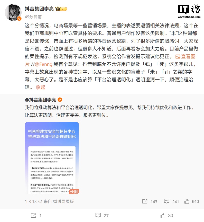 2025-01-07 11:02:40閱讀()互聯(lián)網(wǎng)1月3日,抖音集團(tuán)副總裁李亮發(fā)文宣布將推動(dòng)算法和平臺(tái)治理透明化,當(dāng)晚有網(wǎng)友評(píng)論提出意見(jiàn):“抖音到底允不允許用戶提及‘錢’‘死’這類字眼,字幕上故意出現(xiàn)的各種錯(cuò)別字,以及一些沒(méi)文化的盲流子‘米’‘si’之類的字幕,太惡心了。是不是也應(yīng)該算‘平臺(tái)治理透明化’透明澄清一下,順便治理治理。”