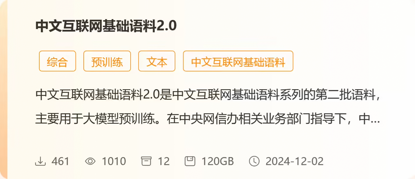 該協(xié)會表示在中央網(wǎng)信辦指導下,會同國家互聯(lián)網(wǎng)應(yīng)急中心,在前期發(fā)布中文互聯(lián)網(wǎng)基礎(chǔ)語料 1.0的基礎(chǔ)上,依托專委會建立的語料共建共享機制,匯聚一批新的高質(zhì)量可信數(shù)據(jù),經(jīng)過信源篩選、內(nèi)容過濾、數(shù)據(jù)去重等一系列嚴格細致的數(shù)據(jù)加工處理措施,形成并對社會發(fā)布中文互聯(lián)網(wǎng)基礎(chǔ)語料2.0,規(guī)模120GB,數(shù)據(jù)3800萬條。