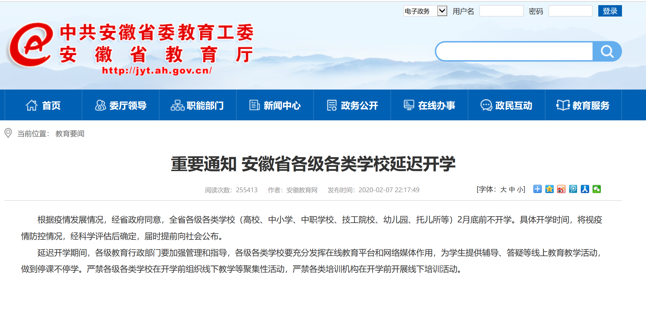 重要通知:安徽省各級(jí)各類學(xué)校延遲開學(xué)