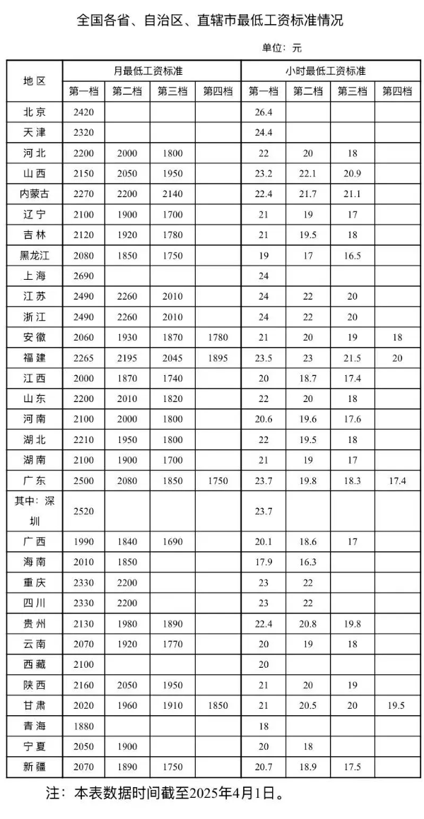 四川、重慶、新疆、山西也調(diào)整了最低工資標準,調(diào)整后的最低工資標準于2025年1月1日起執(zhí)行。