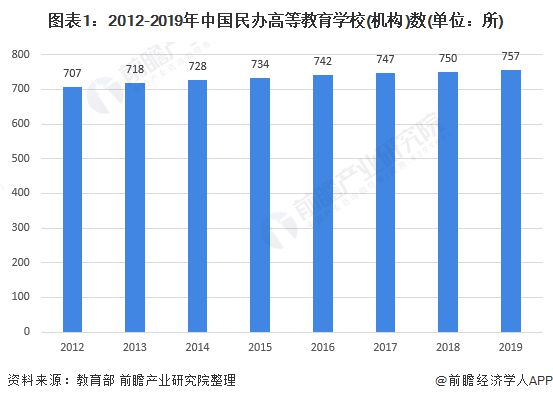 根據(jù)前瞻產(chǎn)業(yè)研究院分析,從民辦高等教育學(xué)校數(shù)量規(guī)模來(lái)看,2012-2019年,全國(guó)民辦高等教育學(xué)校逐年增加,2019年,我國(guó)民辦高等學(xué)校757所(含獨(dú)立學(xué)院257所,成人高校1所),比上年增加7所。