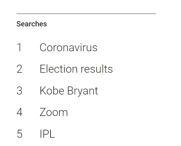 “新冠病毒”作為 2020 年最重要的全球性事件,當(dāng)之無愧是搜索榜的第一名。排在第二位的是 “選舉結(jié)果”,“科比 · 布萊恩特”位列第三。這名傳奇 NBA 球員于2020年1月26日在美國加利福尼亞州因墜機(jī)事故去世。