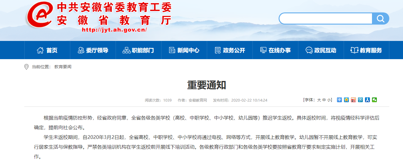 安徽大中小學(xué)3月2日起將全面啟動線上教學(xué)