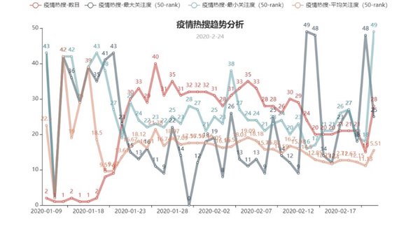 我們對(duì)1月9日至2月21日出現(xiàn)的關(guān)于疫情的熱搜進(jìn)行了統(tǒng)計(jì),從1月10日到1月19日,這十天關(guān)于疫情的熱搜只是一兩條,直到1月20日,熱搜的條目開(kāi)始激增,更是在1月26這一天,占據(jù)了50條熱搜中的40條。