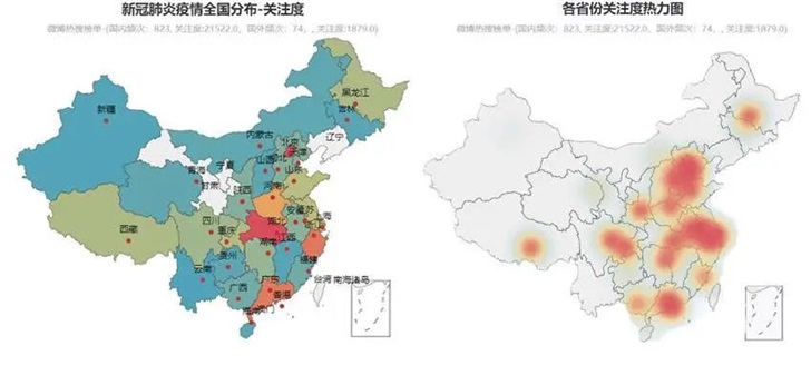 我們對(duì)熱搜中出現(xiàn)的所有地名進(jìn)行了統(tǒng)計(jì),得出了地名的詞云,并畫(huà)出了各省份關(guān)注度的分布和熱力圖??梢钥吹?,武漢和湖北是關(guān)注最多的地方,而河南、山東、浙江、廣東等地區(qū)的出鏡率也很高。
