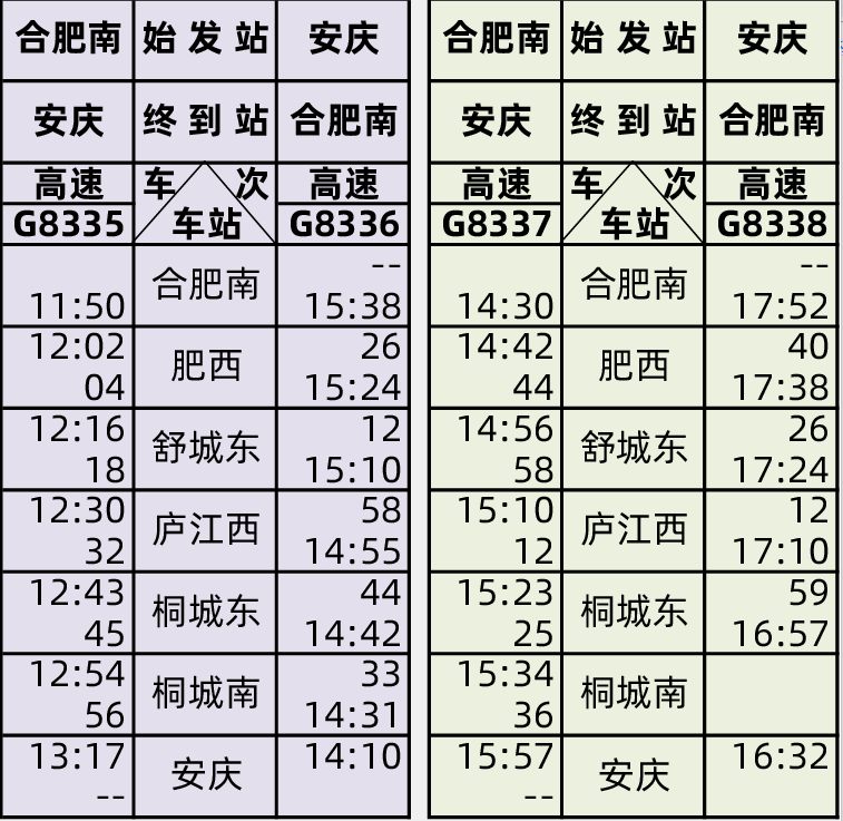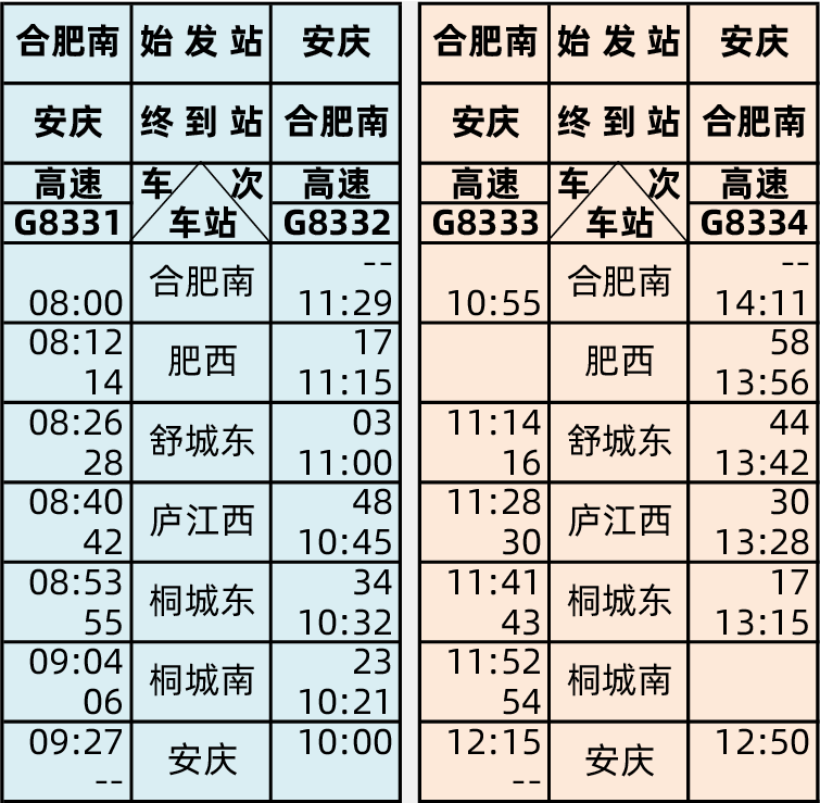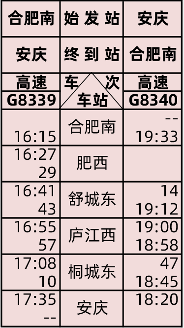據(jù)介紹,京港高鐵合安段開通運(yùn)營(yíng)過渡期,鐵路部門將安排每日開行動(dòng)車組列車5對(duì),具體為:合肥南~安慶G8331/8332、G8333/8334、G8335/8336、G8337/8338、G8339/8340次,具體開行日期以車站公告為準(zhǔn)。