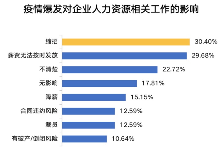 根據(jù)智聯(lián)招聘的調(diào)查,30.4% 的企業(yè)表示將會(huì)減員縮編,還有 29.68% 無(wú)法為員工按時(shí)發(fā)放薪資,無(wú)影響的企業(yè)僅占 17.81% 。另外,慘淡經(jīng)營(yíng)下,降薪、合同違約風(fēng)險(xiǎn)、裁員也成為企業(yè)不得不面對(duì)的問(wèn)題,10.64% 的受訪企業(yè)面臨著破產(chǎn)或倒閉的風(fēng)險(xiǎn)。