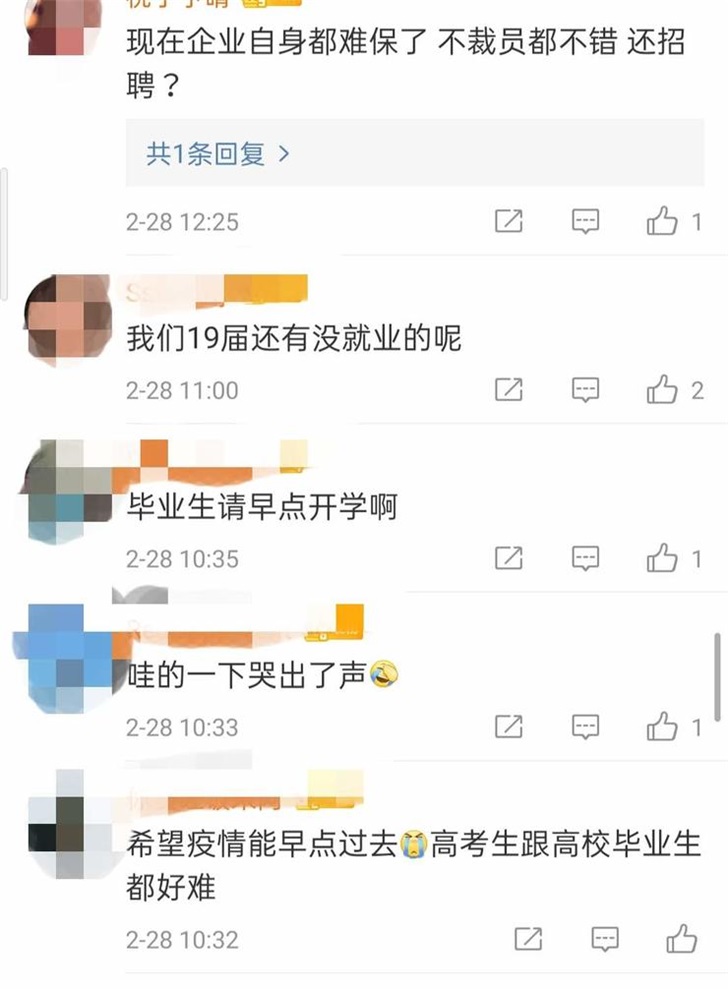 智聯(lián)招聘的數(shù)據(jù)顯示,復(fù)工第一周(2.3-2.7)的招聘職位數(shù)較 2019 年同期下降 71.66% 。與此同時(shí),2019年、2020 年即將畢業(yè)的應(yīng)屆生創(chuàng)下歷史新高,總數(shù)超過(guò) 1700 萬(wàn)人,或?qū)⒚媾R史上最難的畢業(yè)季,部分應(yīng)屆生將"一畢業(yè),就失業(yè)"。