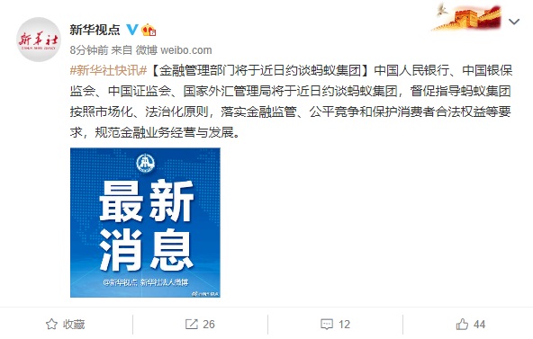 據(jù)新華視點報道,中國人民銀行、中國銀保監(jiān)會、中國證監(jiān)會、國家外匯管理局將于近日約談螞蟻集團(tuán),督促指導(dǎo)螞蟻集團(tuán)按照市場化、法治化原則,落實金融監(jiān)管、公平競爭和保護(hù)消費者合法權(quán)益等要求,規(guī)范金融業(yè)務(wù)經(jīng)營與發(fā)展。