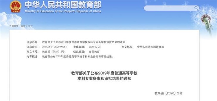 2020 年 3 月 3 日,教育部在官網(wǎng)發(fā)布通知,公布了 2019 年度普通高等學(xué)校本科專業(yè)備案和審批結(jié)果,其中顯示: