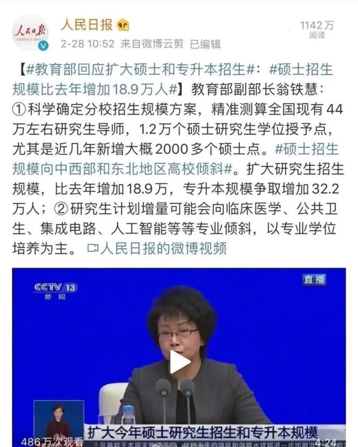 就在 2 月 28 日,國務(wù)院聯(lián)防聯(lián)控機制舉行新聞發(fā)布會,教育部副部長翁鐵慧表示,今年將擴(kuò)大碩士研究生招生規(guī)模,預(yù)計同比增加 18.9 萬人。