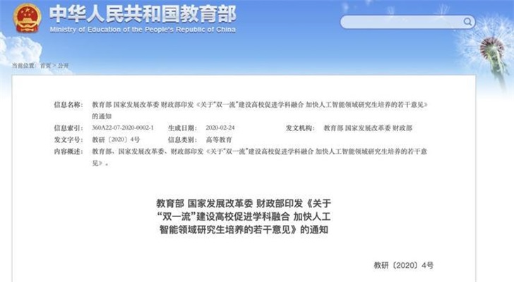 同樣是在 2020 年 3 月 3 日,教育部、國家發(fā)展改革委和財政部等三個部門聯(lián)合印發(fā)了《關(guān)于 “雙一流” 建設(shè)高校促進(jìn)學(xué)科融合 加快人工智能領(lǐng)域研究生培養(yǎng)的若干意見》(以下簡稱《意見》),專門談到了人工智能領(lǐng)域研究生教育的問題。