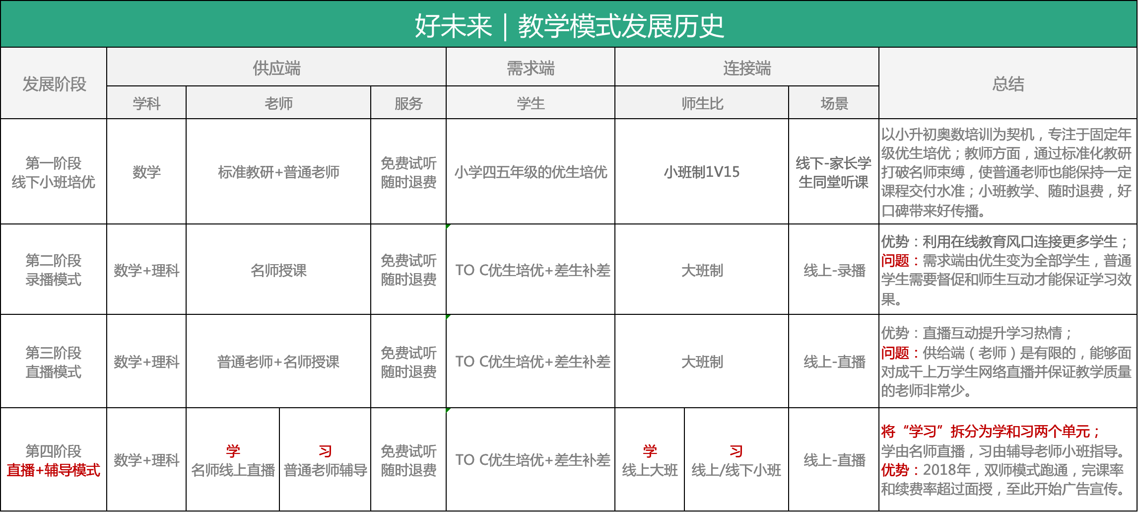 好未來本身擁有培優(yōu)+教研的企業(yè)基因,在發(fā)展之初專注于四五年級數(shù)學(xué)的培優(yōu)教學(xué),“北京優(yōu)秀學(xué)生俱樂部”曾是學(xué)而思早期的宣傳口號。在線下到線上的教學(xué)模式探索中,大致可以分為四個(gè)階段: