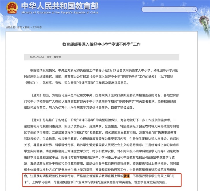 2020-03-07 10:40:54閱讀()教育部國家教育部在3月6日發(fā)布了名為《教育部部署深入做好中小學(xué)“停課不停學(xué)”工作》,其中要求嚴(yán)格禁止普遍要求教師直播上課或錄課,不得強(qiáng)行要求學(xué)生每天上網(wǎng)“打卡”、上傳學(xué)習(xí)視頻。