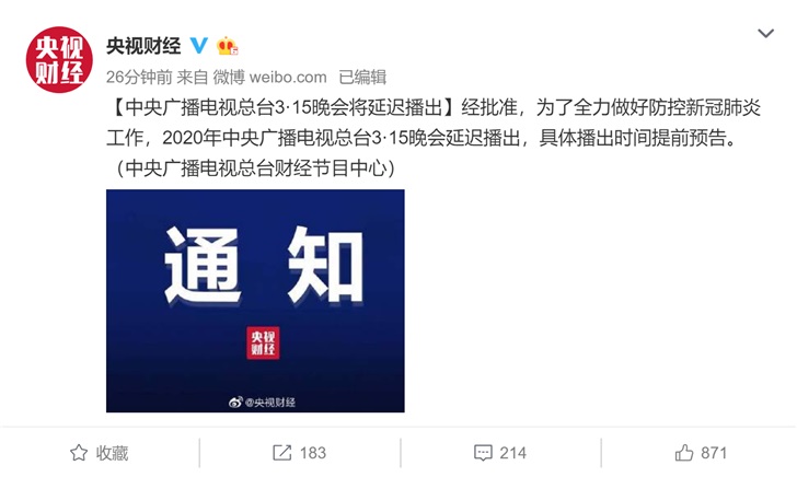 經(jīng)批準(zhǔn),為了全力做好防控新冠肺炎工作,2020年中央廣播電視總臺(tái)3·15晚會(huì)延遲播出,具體播出時(shí)間提前預(yù)告。