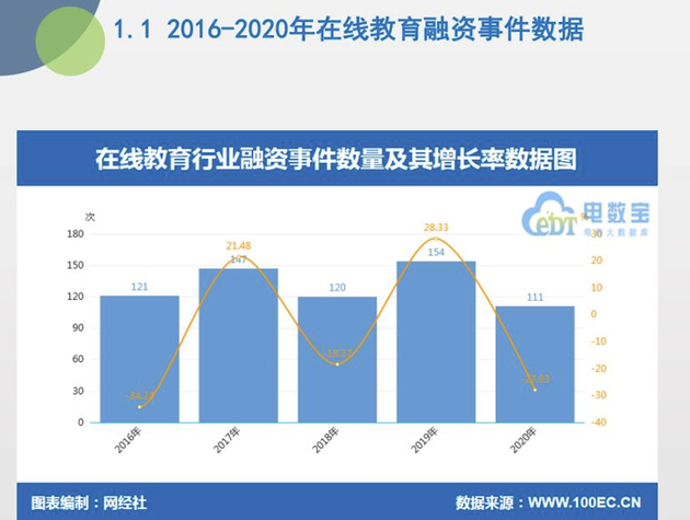 2020 年,資本對(duì)于在線教育的狂熱程度,可以從一組數(shù)據(jù)中看出端倪。根據(jù)網(wǎng)經(jīng)社電子商務(wù)研究中心發(fā)布的《2020 年度中國(guó)在線教育投融資數(shù)據(jù)報(bào)告》(以下稱 “報(bào)告”),2020 年中國(guó)在線教育領(lǐng)域共發(fā)生 111 起融資,同比下降 27.93%。