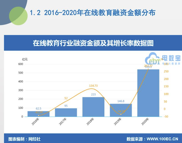 但是,在線教育領(lǐng)域的融資總額卻達(dá)到了歷史高位,融資總額超過 539.3 億元,同比增長(zhǎng) 267.37%。這一總額比 2016 年到 2019 年四年的融資總額都要多。