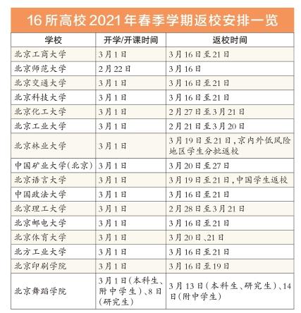2021-02-18 11:03:33閱讀()北京日?qǐng)?bào)對(duì)于在京高校大學(xué)生而言,即將到來(lái)的2021年春季學(xué)期,“如期開(kāi)學(xué)、延遲返校”將成為潮流。記者近日從官方渠道了解到,北京師范大學(xué)、北京交通大學(xué)、北京科技大學(xué)、北京化工大學(xué)等16所在京高校均發(fā)布最新通知,新學(xué)期在原計(jì)劃的開(kāi)學(xué)之日以線上教學(xué)方式開(kāi)課,時(shí)間大多集中于3月1日;學(xué)生返校日期則延后至3月中下旬。