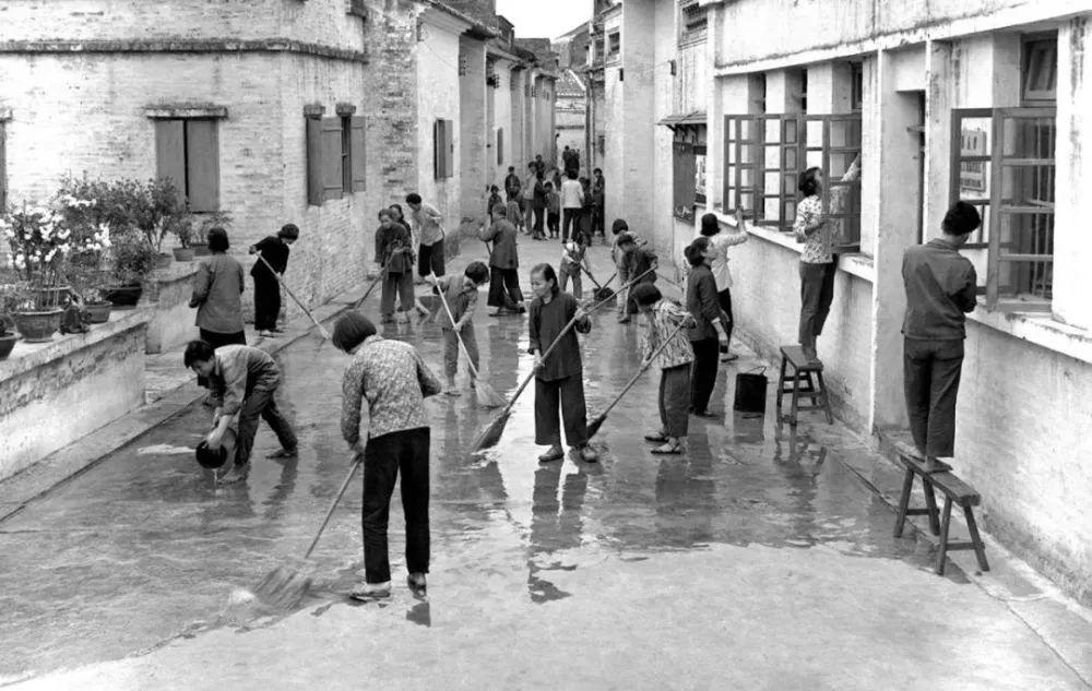 1966年1月17日,全國衛(wèi)生紅旗單位廣東省佛山市在春節(jié)前夕,又掀起一個愛國衛(wèi)生運(yùn)動的高潮。圖為佛山市滘邊街居民在洗刷街道。新華社記者 李開遠(yuǎn) 攝