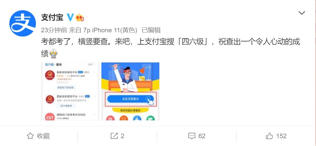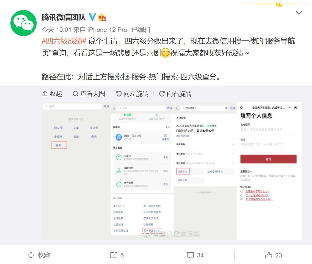 今日午間,@支付寶 微博發(fā)文稱,用戶可通過(guò)支付寶搜索 “四六級(jí)”查分。26日上午,微信也發(fā)布消息稱,微信搜一搜聯(lián)合國(guó)家政務(wù)服務(wù)平臺(tái)為廣大考生提供四六級(jí)成績(jī)查詢服務(wù)。屆時(shí),廣大考生可通過(guò)微信搜一搜進(jìn)行四六級(jí)查分,具體路徑為:對(duì)話上方搜索框 - 服務(wù) - 熱門(mén)搜索 - 四六級(jí)查分。