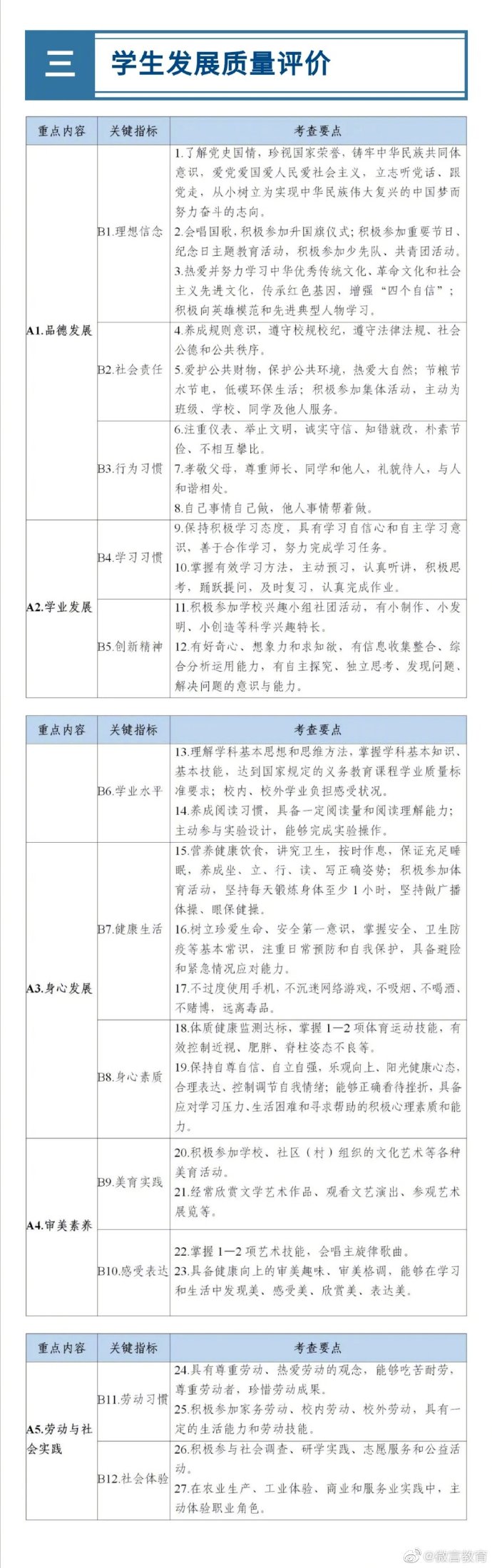 (三)學(xué)生發(fā)展質(zhì)量評(píng)價(jià)。主要包括學(xué)生品德發(fā)展、學(xué)業(yè)發(fā)展、身心發(fā)展、審美素養(yǎng)、勞動(dòng)與社會(huì)實(shí)踐等五個(gè)方面重點(diǎn)內(nèi)容,旨在促進(jìn)學(xué)生德智體美勞全面發(fā)展,培養(yǎng)適應(yīng)終身發(fā)展和社會(huì)發(fā)展需要的正確價(jià)值觀、必備品格和關(guān)鍵能力。