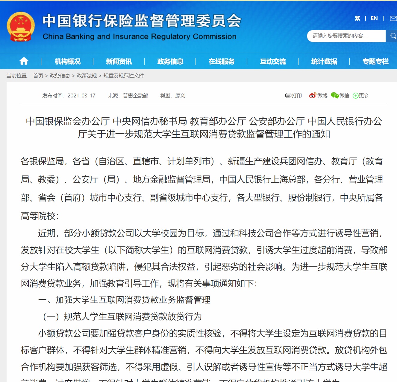 3月17日,銀保監(jiān)會(huì)官網(wǎng)發(fā)布《關(guān)于進(jìn)一步規(guī)范大學(xué)生互聯(lián)網(wǎng)消費(fèi)貸款監(jiān)督管理工作的通知》(下稱《通知》)。該《通知》由銀保監(jiān)會(huì)辦公廳、中央網(wǎng)信辦秘書(shū)局、教育部辦公廳、公安部辦公廳、人民銀行辦公廳于近日聯(lián)合印發(fā)。