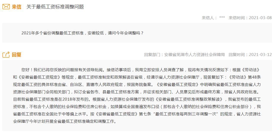 網友問, 2021年多個省份調整最低工資標準,安徽較低,請問今年會調整嗎?