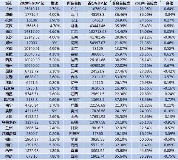 2020年,27個省會城市中有17個城市的GDP超過5000億元,11個城市突破萬億元大關(guān),萬億級城市比上一年度增加了4個。位居前十名的城市分別是廣州、成都、杭州、武漢、南京、長沙、鄭州、濟南、合肥和西安。