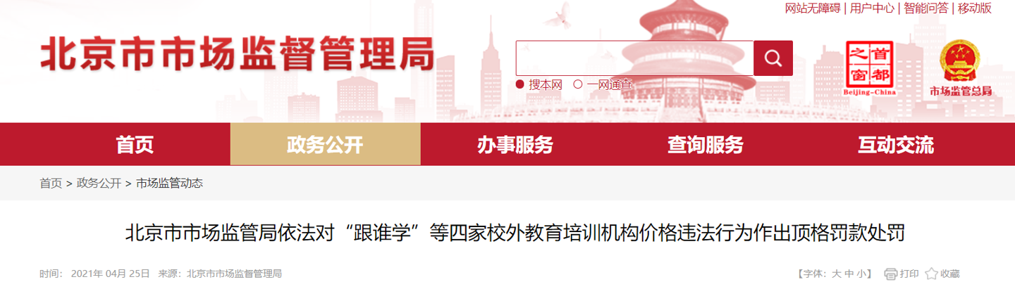 北京市市場監(jiān)管局依法對“跟誰學(xué)”等四家校外教育培訓(xùn)機構(gòu)價格違法行為作出頂格罰款處罰