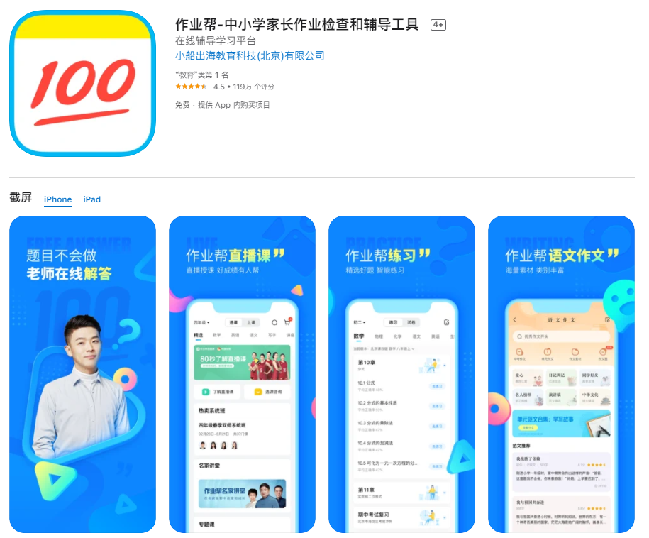 作業(yè)幫是Baidu于2014年1月推出的一款支持Android以及iOS平臺的K12在線教育類型的App,累計激活用戶設備突破8億,月活用戶約1.7億。