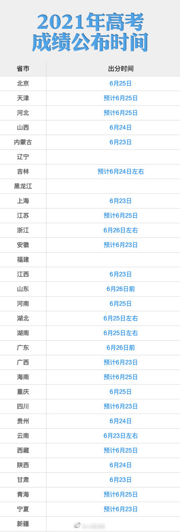 根據(jù)各省份此前公布的時(shí)間,6月23日起各地將陸續(xù)公布高考成績(jī),查分時(shí)間主要集中在23至26日。