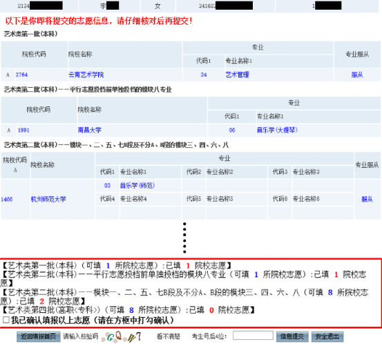 請(qǐng)考生務(wù)必再次仔細(xì)核對(duì)自己的信息,確認(rèn)無誤后輸入校驗(yàn)碼并點(diǎn)擊“信息提交”按鈕提交志愿信息,信息一旦提交將無法重填或修改,請(qǐng)慎重操作。若希望重新填報(bào)志愿,切勿點(diǎn)擊“信息提交”,請(qǐng)點(diǎn)擊“返回填報(bào)首頁”按鈕返回首頁并重新填報(bào)。