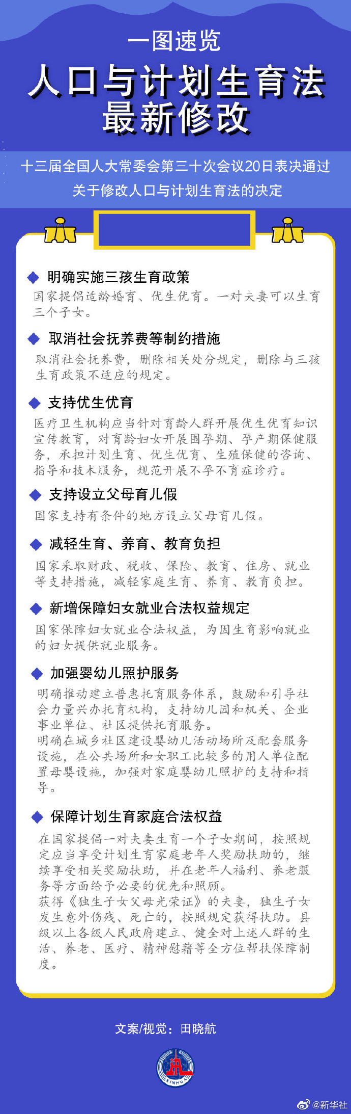 全國人大常委會會議20日表決通過了關(guān)于修改人口與計劃生育法的決定。修改后的人口計生法規(guī)定,國家提倡適齡婚育、優(yōu)生優(yōu)育,一對夫妻可以生育三個子女。國家采取財政、稅收、保險、教育、住房、就業(yè)等支持措施,減輕家庭生育、養(yǎng)育、教育負(fù)擔(dān)。