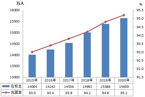 全國(guó)共有義務(wù)教育階段學(xué)校21.08萬(wàn)所,招生3440.19萬(wàn)人,在校生1.56億人,專(zhuān)任教師1029.49萬(wàn)人,九年義務(wù)教育鞏固率[5] 95.2%。