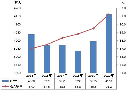 全國(guó)共有高中階段教育學(xué)校2.45萬(wàn)所,比上年增加82所,增長(zhǎng)0.34%;招生1521.10萬(wàn)人,比上年增加81.24萬(wàn)人,增長(zhǎng)5.64%;在校生4163.02萬(wàn)人,比上年增加168.12萬(wàn)人,增長(zhǎng)4.21%。高中階段毛入學(xué)率91.2%,比上年提高1.7個(gè)百分點(diǎn)。