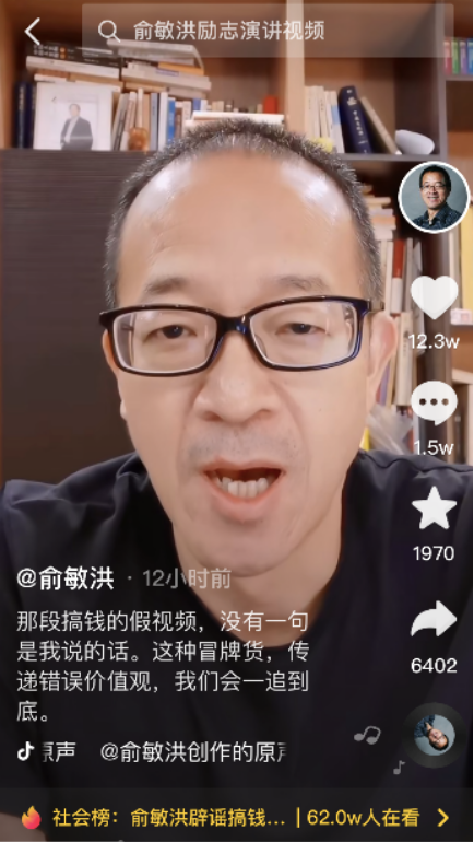 針對這些搞錢言論視頻,俞敏洪本人通過個人抖音社交賬號發(fā)布了一段小視頻進(jìn)行辟謠:“那段搞錢的假視頻,沒有一句是我說的話。這種冒牌貨,傳遞錯誤價值觀,我們會一追到底。”