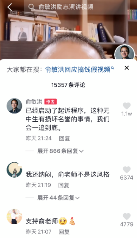 俞敏洪在視頻中表示:“這個搞錢的視頻完全不是我講的話,中間所傳遞的價值觀也是我最反對的”。并稱,將起訴“胡作非為、胡編亂造的人,并對其提出嚴(yán)重警告。請記住了,我會緊追不放。”