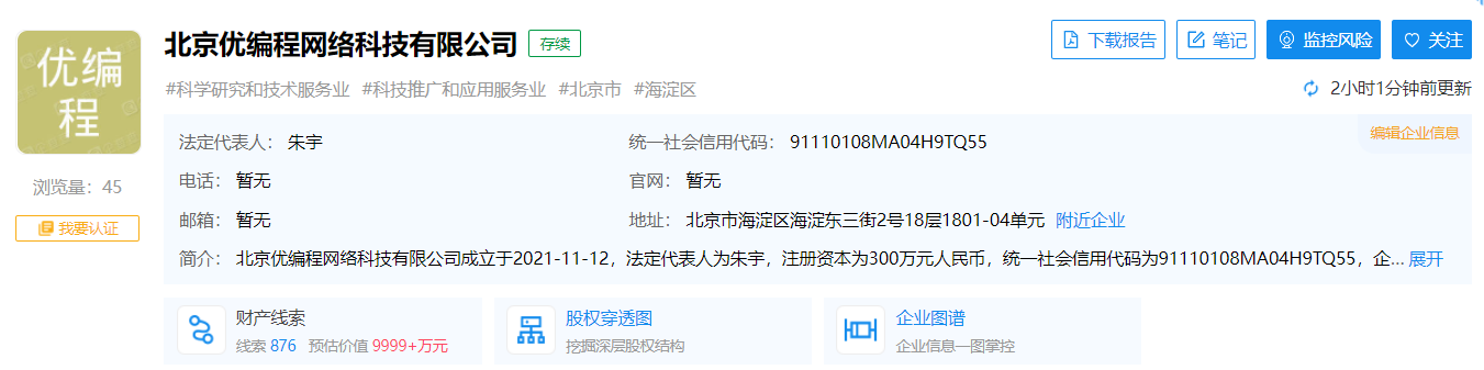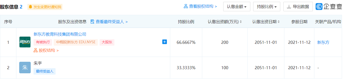 企查查App顯示,近日,北京優(yōu)編程網(wǎng)絡(luò)科技有限公司成立,注冊(cè)資本300萬人民幣,法定代表人為朱宇,經(jīng)營范圍包括軟件開發(fā);模型設(shè)計(jì);教育咨詢;銷售文化用品、計(jì)算機(jī)、軟件及輔助設(shè)備等。股東信息顯示,該公司由新東方教育科技集團(tuán)有限公司、朱宇分別持股約66.67%、33.33%。