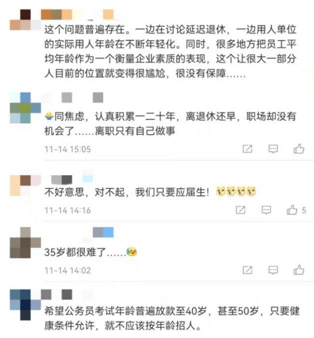 近年來,國家高度重視“35歲現(xiàn)象”,一些地區(qū)公務(wù)員招錄已經(jīng)在放寬年齡限制:比如山東事業(yè)編招考,多年來把招考年齡限制在40周歲以下。浙江今年宣布,對于2022年應(yīng)屆碩士、博士研究生(非在職人員),放寬到40周歲以下。今年全國兩會,全國人大代表、編劇蔣勝男建議,取消國家公務(wù)員報考35歲以下的年齡限制。