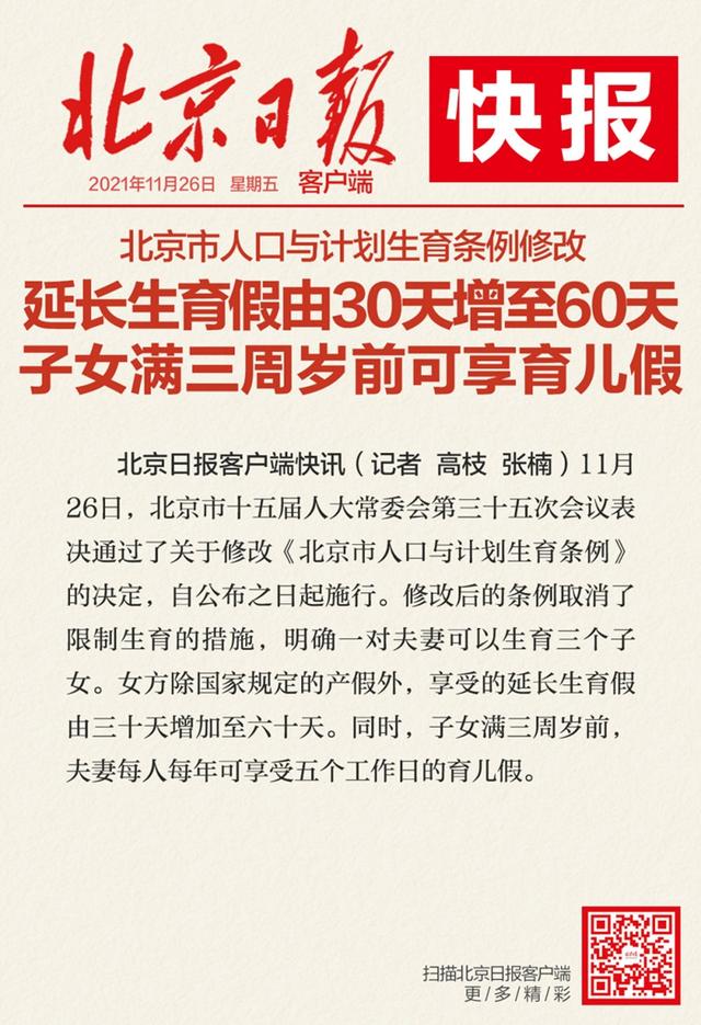 11月26日上午,北京市十五屆人大常委會(huì)第三十五次會(huì)議表決通過(guò)了關(guān)于修改《北京市人口與計(jì)劃生育條例》的決定,自公布之日起施行。修改后的條例取消了限制生育的措施,明確一對(duì)夫妻可以生育三個(gè)子女。女方除國(guó)家規(guī)定的產(chǎn)假外,享受的延長(zhǎng)生育假由三十天增加至六十天。同時(shí),子女滿三周歲前,夫妻每人每年可享受五個(gè)工作日的育兒假。