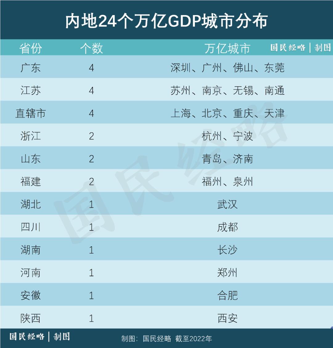 早在改革開放之初的1978年,廣東經(jīng)濟總量落后于上海、江蘇、山東、遼寧等省份。1979年到1988年,江蘇、山東曾輪流位居全國首位,直到被廣東所取代,且領(lǐng)先優(yōu)勢不斷增強。30多年來,廣東GDP總量從1989年的1400億增長到12萬億,無論是增長速度還是發(fā)展質(zhì)量,均是首屈一指。這些年,廣東經(jīng)受了非典、全球金融危機、新冠疫情等沖擊,但借助強大的經(jīng)濟韌性,始終保持著高增長態(tài)勢,穩(wěn)居全國經(jīng)濟第一大省之位。國民經(jīng)略主筆 凱風(fēng) 新著,清華大學(xué)出版社出品,點擊圖片查看02廣東,是全國萬億GDP城市最多的省份之一。截至2022年,全國共有24個萬億GDP城市,其中南方18個,北方6個。廣東與江蘇,各有4個城市入圍,領(lǐng)跑各大省份。