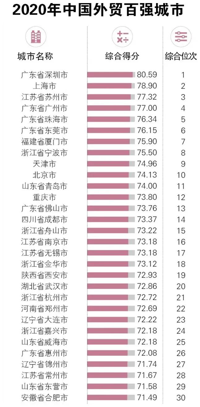 可以說,先進(jìn)制造業(yè)的發(fā)展,決定了工業(yè)大省發(fā)展的未來。誰能在戰(zhàn)略性新興產(chǎn)業(yè)里搶得先機,誰就能在未來的發(fā)展中占據(jù)優(yōu)勢。06廣東,第一外貿(mào)大省。2021年,廣東外貿(mào)進(jìn)出口總額突破8萬億元,超過全國(39.1萬億元)的1/5,連續(xù)35年位居全國第一。作為“世界制造工廠”,廣東一直都是傳統(tǒng)外貿(mào)大省,其中以智能手機、家用電器、液晶顯示等為代表的機電產(chǎn)品占了出口的半壁江山。在2021年中國海關(guān)發(fā)布的外貿(mào)百強城市榜單中,TOP10城市里廣東占了4席,包括深圳、廣州、東莞、珠海。
