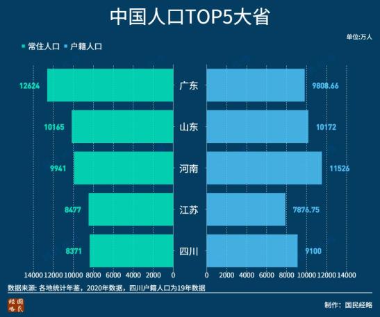 其中,廣州深圳在2010年前后就已邁入萬億俱樂部,佛山則是2019年突圍,東莞在2021年晉級,也是當(dāng)年唯一晉級的萬億城市。(參閱《官宣!又一個萬億GDP城市誕生》)眾所周知,廣東之強,強在珠三角。而在珠三角,廣深是龍頭,佛莞是省級經(jīng)濟中心城市,其他地市經(jīng)濟總量都不高,離萬億大關(guān)都還有相當(dāng)長的距離。在東莞之后,惠州、珠海、汕頭、湛江等地市GDP不到5000億,想要突破萬億,可能需要5-8年時間。面向未來,惠州表示2026年GDP突破8000億元,珠海則表示力爭五年GDP超6000億元,2035年突破2萬億。就全國來看,未來5年,將會有一批城市沖刺萬億俱樂部,包括江蘇常州、徐州,山東煙臺,遼寧大連,河北唐山等。03廣東還是全國人口第一大省。2020年底,廣東常住人口高達(dá)1.26億人,比第二名的山東省多了2400多萬,相當(dāng)于多了一個上海的人口規(guī)模。當(dāng)然,若論戶籍,第一人口大省當(dāng)屬河南。不過,河南由于大量勞動力到外務(wù)工,常住人口比戶籍人口少了1600萬人。(參閱《這些超級人口大省,也生不動了》)