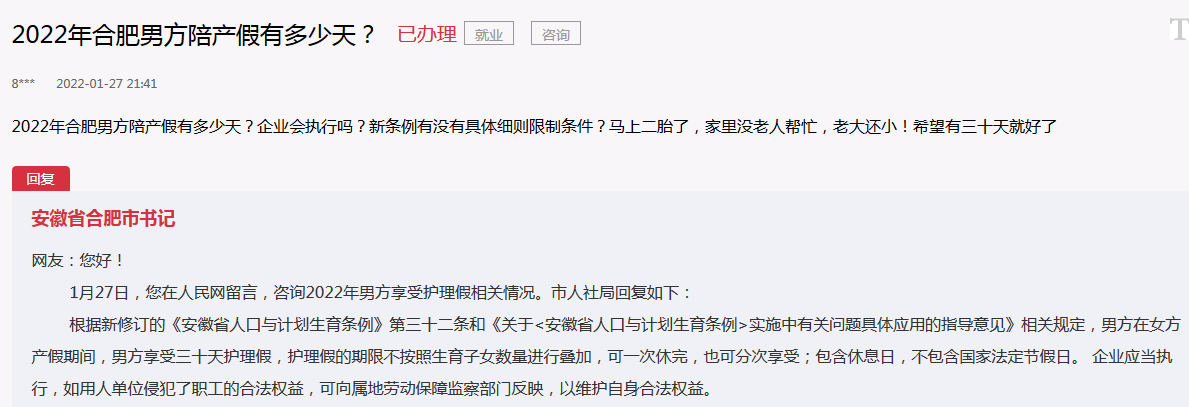 2022-02-15 11:53:08閱讀()合肥市人社局近日,有網(wǎng)友在人民網(wǎng)留言問(wèn),2022年合肥男方陪產(chǎn)假有多少天?企業(yè)會(huì)執(zhí)行嗎?