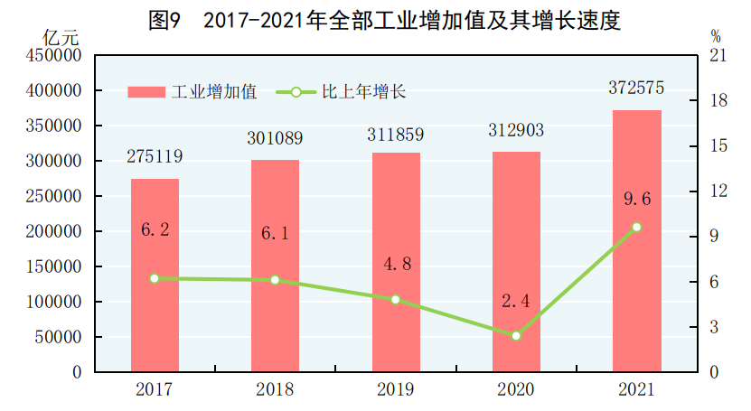 全年全部工業(yè)增加值372575億元,比上年增長(zhǎng)9.6%。規(guī)模以上工業(yè)增加值增長(zhǎng)9.6%。在規(guī)模以上工業(yè)中,分經(jīng)濟(jì)類型看,國(guó)有控股企業(yè)增加值增長(zhǎng)8.0%;股份制企業(yè)增長(zhǎng)9.8%,外商及港澳臺(tái)商投資企業(yè)增長(zhǎng)8.9%;私營(yíng)企業(yè)增長(zhǎng)10.2%。分門類看,采礦業(yè)增長(zhǎng)5.3%,制造業(yè)增長(zhǎng)9.8%,電力、熱力、燃?xì)饧八a(chǎn)和供應(yīng)業(yè)增長(zhǎng)11.4%。