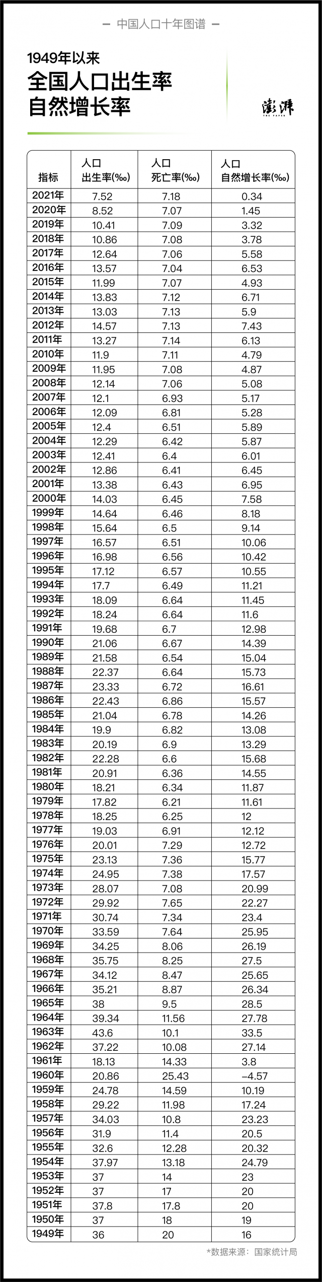 全國而言,去年全國的人口出生率為1949年以來最低,而人口自然增長率為1961年以來首次降到1‰以下。