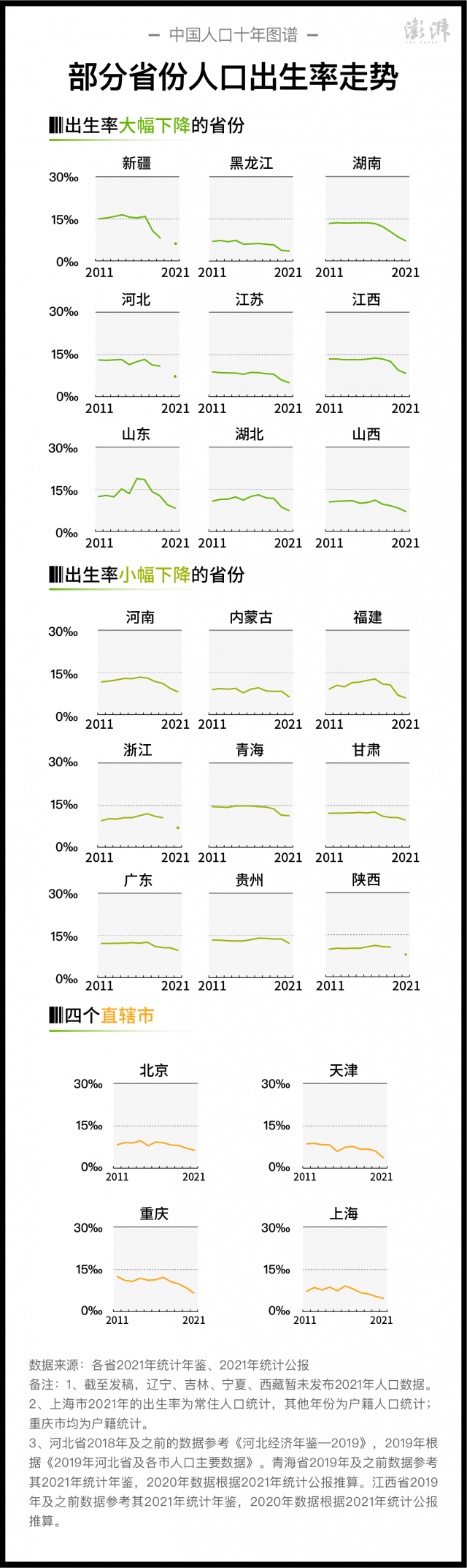 從出生率來看,已公布的省份中,2021年排在前三的省份為貴州省、青海省、甘肅省,分別為12.17‰、11.22‰、9.68‰;黑龍江省、上海市、江蘇省,為公布省份中2021年生育率最低的三省市,分別為3.59‰、4.67‰、5.7‰。2011年,出生率排在前三的省區(qū)為西藏、新疆、青海(注:海南由于統(tǒng)計年鑒未公布這一年的出生率未計入),分別為15.39‰、14.99‰、14.43‰。