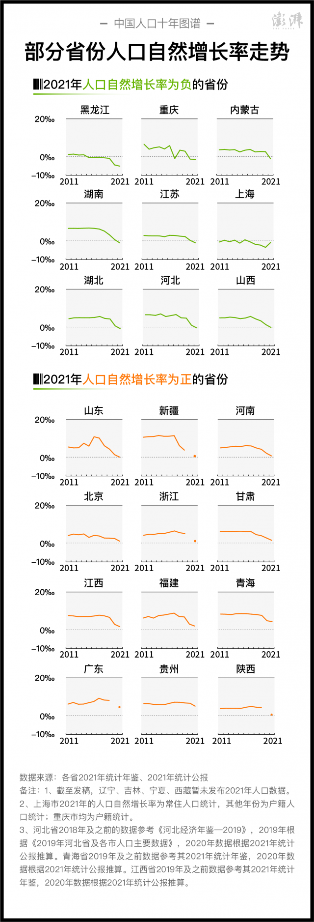 從自然增長率來看,已公布的數(shù)據(jù)中,2021年有9個省區(qū)市為負數(shù),包括山西、河北、湖北、上海、江蘇、湖南、內(nèi)蒙古、重慶和黑龍江,其中,黑龍江省最低,為-5.11‰。最高的三省為貴州省、廣東省和青海省,分別為4.98‰、4.52‰、4.31‰。2011年,自然增長率最高的三省區(qū)為新疆、西藏、寧夏,分別為10.57‰、10.26‰、8.97‰。人口自然增長率是指在一定時期內(nèi)(通常為一年)人口自然增加數(shù)(出生人數(shù)減死亡人數(shù))與該時期內(nèi)平均人數(shù)(或期中人數(shù))之比,一般用千分率表示。值得注意的是,人口自然增長為負數(shù)的情況下,如果外來人口凈流入抵消了人口減少,常住人口數(shù)量依然會繼續(xù)增長,如江蘇。
