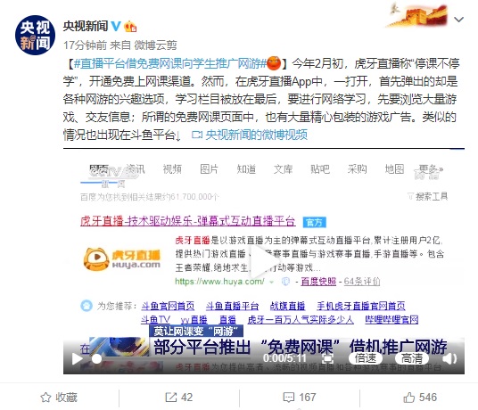 虎牙等直播平臺(tái)被央視點(diǎn)名:網(wǎng)課內(nèi)容到處充斥游戲廣告
