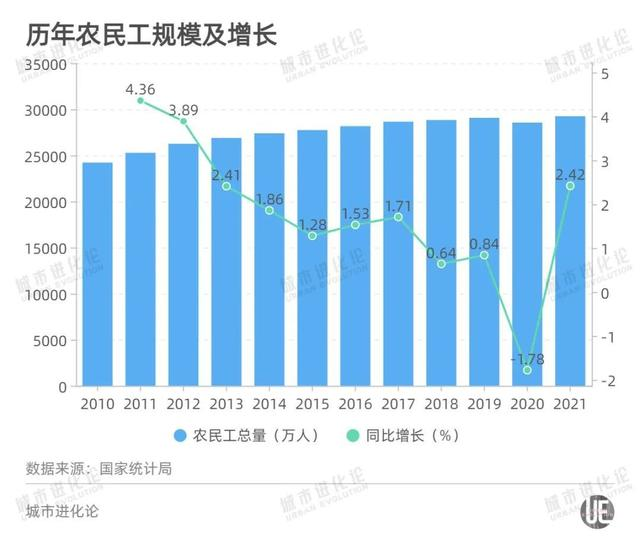總量還在增長,但是增速已經(jīng)減緩了。2021年,全國農(nóng)民工總量29251萬人,與2019年相比只增加174萬人。